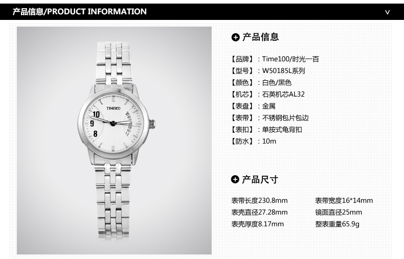 时光一百(TIME100)女表小表盘简约防水女士腕表套装女手链手表七夕礼物送女友W50888L钢色