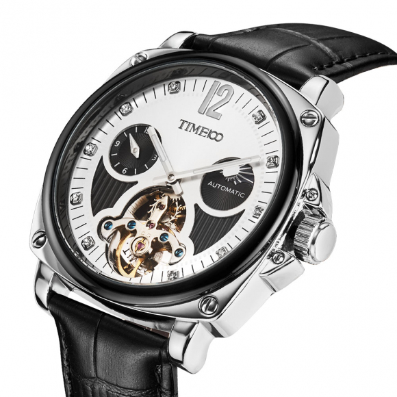 时光一百 休闲商务月相镂空机械表皮带男表
