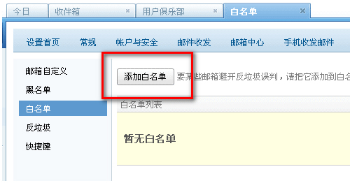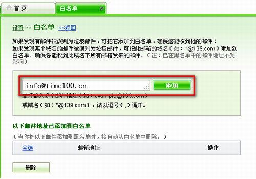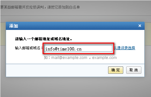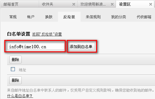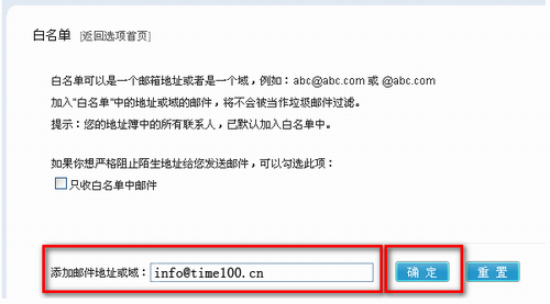 第三步:在“白名单”中填写上“info@time100.cn”,并点击“添加”按钮即可完成设置。
