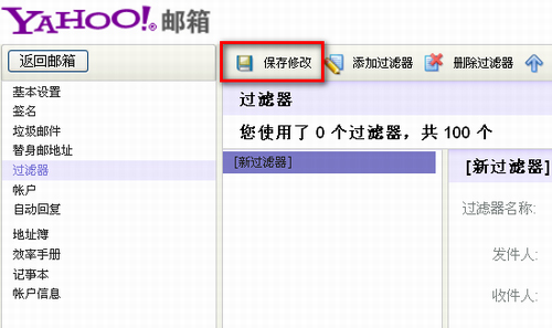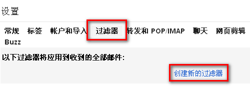 第二步:点击设置页面中的“过滤器”,然后点击页面上蓝色链接字“创建新的过滤器”。