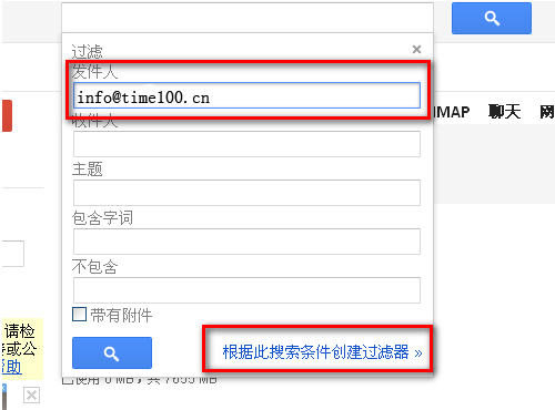 第三步:在打开的窗口“发件人”位置输入“info@time100.cn”后点击下方的“根据此搜索条件创建过滤器”