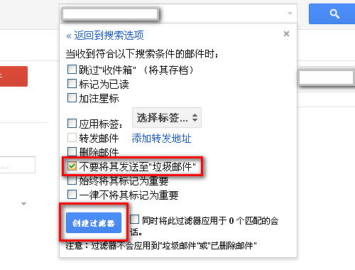 第四步:勾选“不要将其发送至垃圾邮箱”后点击“创建过滤器”即可完成设置。