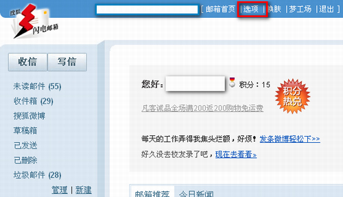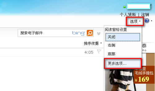 第一步:打开邮箱,点页面右上方“选项”,在下拉菜单中点“更多选项”。