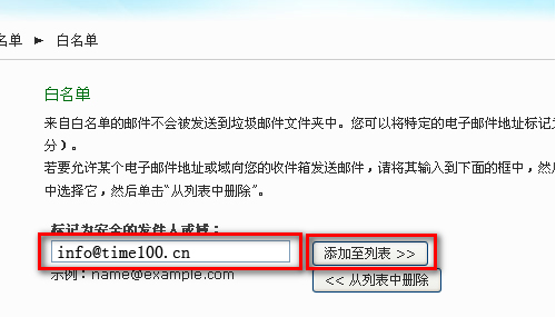 第四步:在“白名单”中的方框中填入“info@time100.cn”,然后点击“添加至列表”即可完成设置。