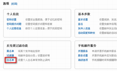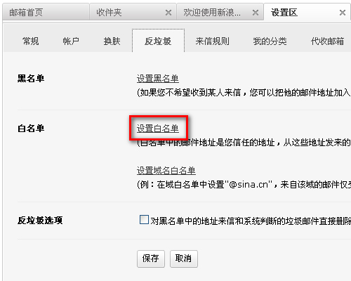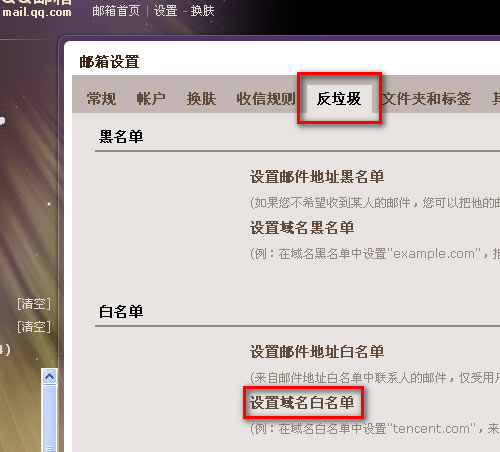 第二步:在邮箱设置页面点击“反垃圾”标签下的“设置域名白名单”。