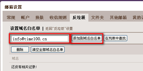 第三步:在“设置域名白名单”中填写“info@time100.cn”,并点击“添加到域名白名单”按钮即可完成设置。