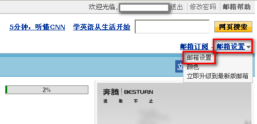 第一步:打开邮箱后,点击页面右上侧“邮箱设置”,在下来菜单中点击“邮箱设置”。