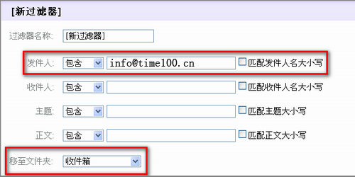 第三步:在过滤器页面中“收件人”中填写“info@time100.cn”;在“移至文件夹”中选择“收件箱”。