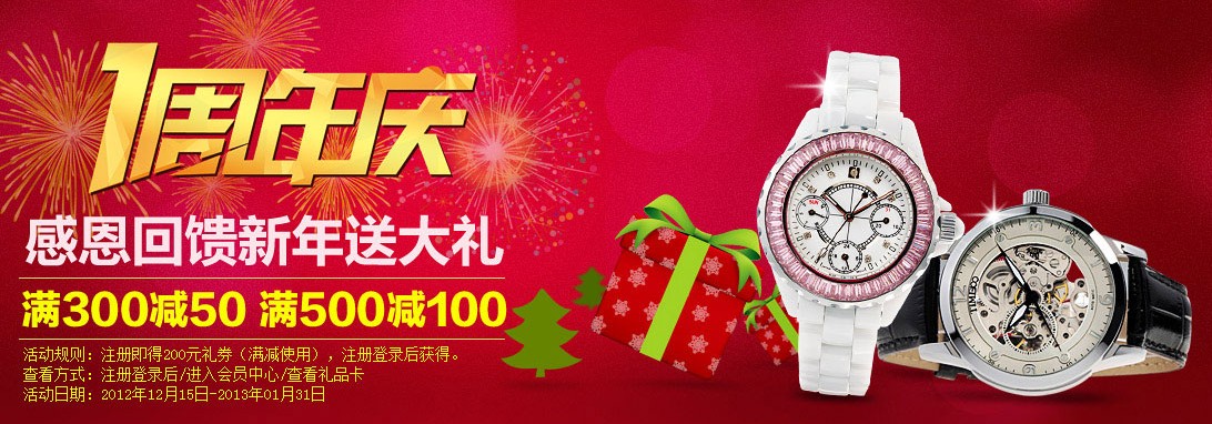 12月15日,TIME100手表1周年店庆即将拉开帷幕,据悉此次活动涉及132种商品,为了让网民更精准选购,活动一改往日的全场策略,分别设置了爆款区、精品区、儿童区、情侣区、团购区等等。促销商品全场包邮,店庆活动一直持续到2013年1月31日,超长战线的活动体现了这次实在、实惠的店庆精神。