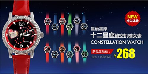 2013年蛇年伊始,TIME100/时光一百作为手表电商隆重推出最受大家欢迎的星座机械表,对于12星座大家并不陌生,尤其是女性朋友,恨不得天天在 网上查看自己每天的星座运势,自己的心情也跟着运势跌宕起伏。时光一百公司通过多方数据调研从款式、颜色、性能以及12星座性格原型等方面进行剖析,在金 蛇年为所有网民提供运势护身法宝。